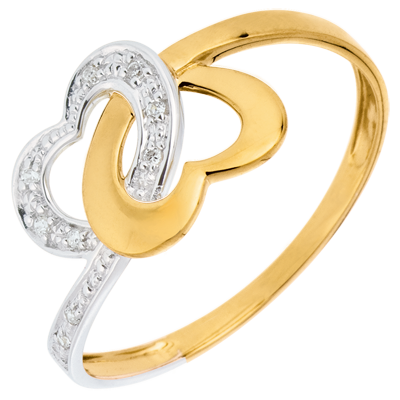 Dwa zakochane serca ze złota przenikają się, aby się połączyć. Połowa z białego złota i diamentów oraz połowa z żółtego złota.