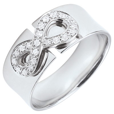 Znak nieskończoności z białego złota i diamentów na szerokiej i kunsztownej oprawie. Symbol absolutnej wieczności.