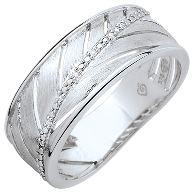 Szeroka obrączka ze szczotkowanego białego złota inspirowana liściem palmowym. Łodyga jest ozdobiona diamentami. Pierścionek doskonale nadaje się do noszenia na co dzień lub na wielkie okazje.