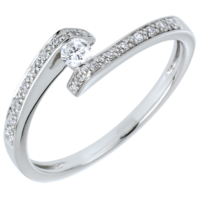 Pierścionek Drogocenne Gniazdo z pojedynczym diamentem w towarzystwie innych diamentów - Obietnica z białego złota 9-karatowego