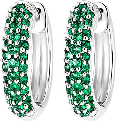 Kolczyki kółka z białego złota wysadzane trzema rzędami 62 subtelnych szmaragdów. Klasyczna, ponadczasowa biżuteria z barwnym akcentem.