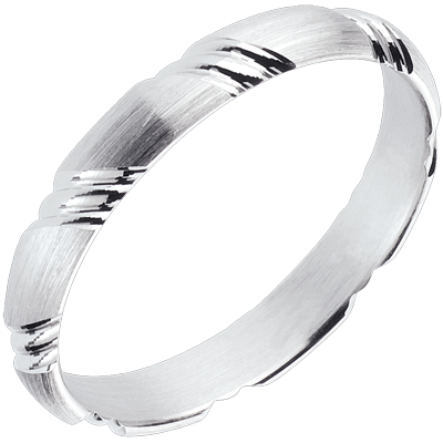Obrączka z białego złota, delikatnie stylizowana, z plecionym motywem.