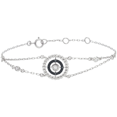 Koło ze złotych pereł otacza koło diamentów towarzyszących diamentowi środkowemu. Bransoletka o regulowanej długości: 18 cm, 17 cm, 16 cm. Wzór o długości 11 mm i wysokości 11 mm.