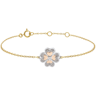 Nowoczesna bransoletka z czterolistną koniczyną rozświetloną diamentem środkowym, o powierzchni wykonanej z polerowanego różowego złota, z motywami złotych kwiatów. Bransoletka o regulowanej długości: 18 cm, 17 cm, 16 cm.