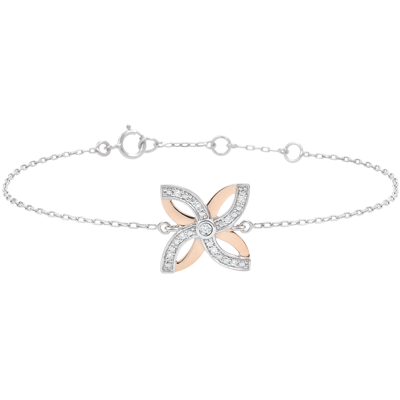 Stylizowana lilia z różowego złota i diamentów na cienkim i kunsztownym łańcuszku. Bransoletka o regulowanej długości: 18 cm, 17 cm, 16 cm. Wzór o długości 12 mm i wysokości 12 mm.