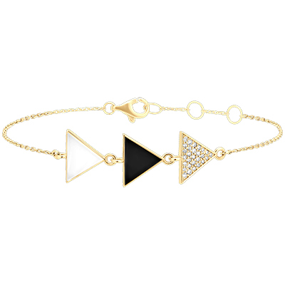 Delikatna bransoletka z żółtego złota, ozdobiona trzema przeplatającymi się trójkątami - jeden wysadzany diamentami, pozostałe pokryte kontrastową czarno-białą emalią. Nowoczesne, eleganckie połączenie kształtów i refleksów światła.