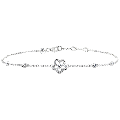 Słodka i delikatna bransoletka z białego złota ozdobiona diamentem środkowym otoczonym 5 płatkami z diamentów.