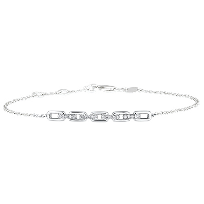 Pięć dużych kubańskich ogniw wysadzanych diamentami stanowiących kontrast z delikatnym łańcuszkiem, tworząc klasyczną bransoletkę z białego złota w nowoczesnej odsłonie. Bransoletka z możliwością regulacji długości: 18cm, 17cm, 16cm.