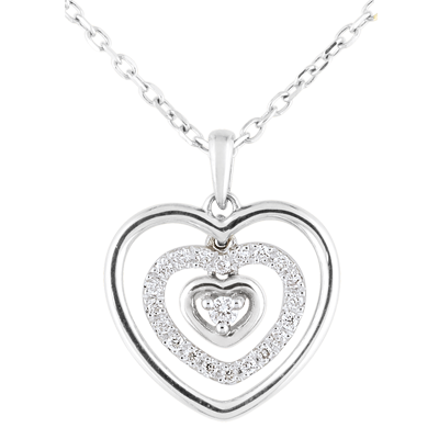 Trzy zwiewne, ruchome serca – dwa serca ze złota i jedno serce wysadzane diamentami z diamentem środkowym oprawionym w trzy krapy.