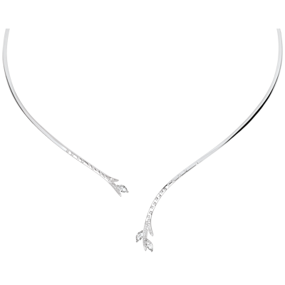 Błyszcząca gałąź utrwalona w ponadczasowej odsłonie. Jej kunsztowny liść, diamentowa łezka, jest podkreślony oprawą z białego złota wysadzanego brylantami.