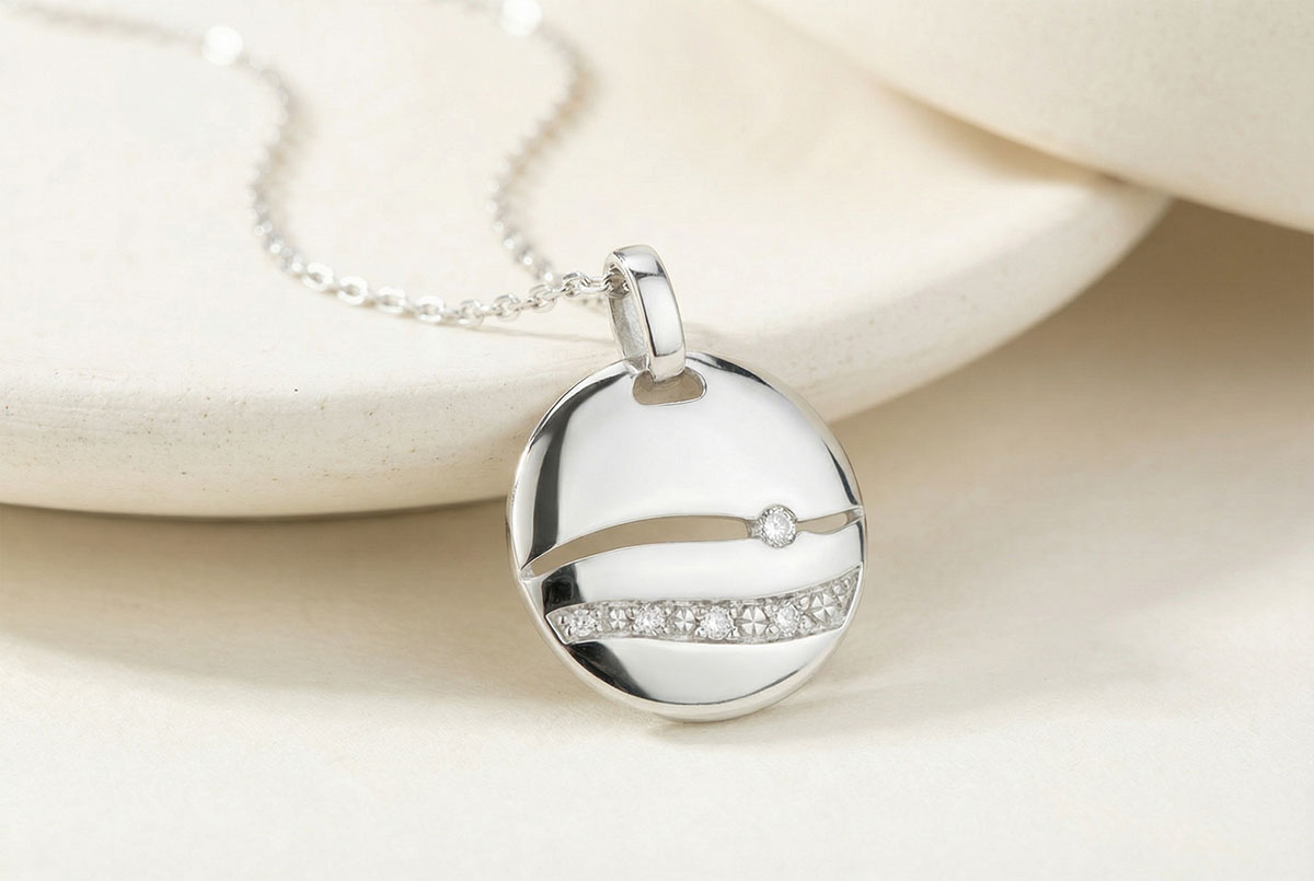 Łańcuszek o okrągła zawieszka, na której nakreślono diamentami zachód słońca nad morzem.