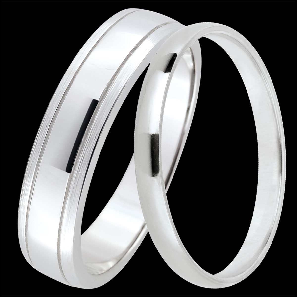 Elegancka para obrączek ślubnych dla niej i niego. Dla niej subtelna, polerowana obrączka o szerokości 2 mm, dla niego matowa obrączka z białego złota ozdobiona lśniącym, poziomym paskiem.