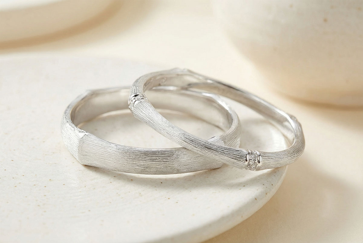 Elegancka para obrączek z białego złota, inspirowanych subtelnym kształtem gałązki bambusa z matowym wykończeniem.