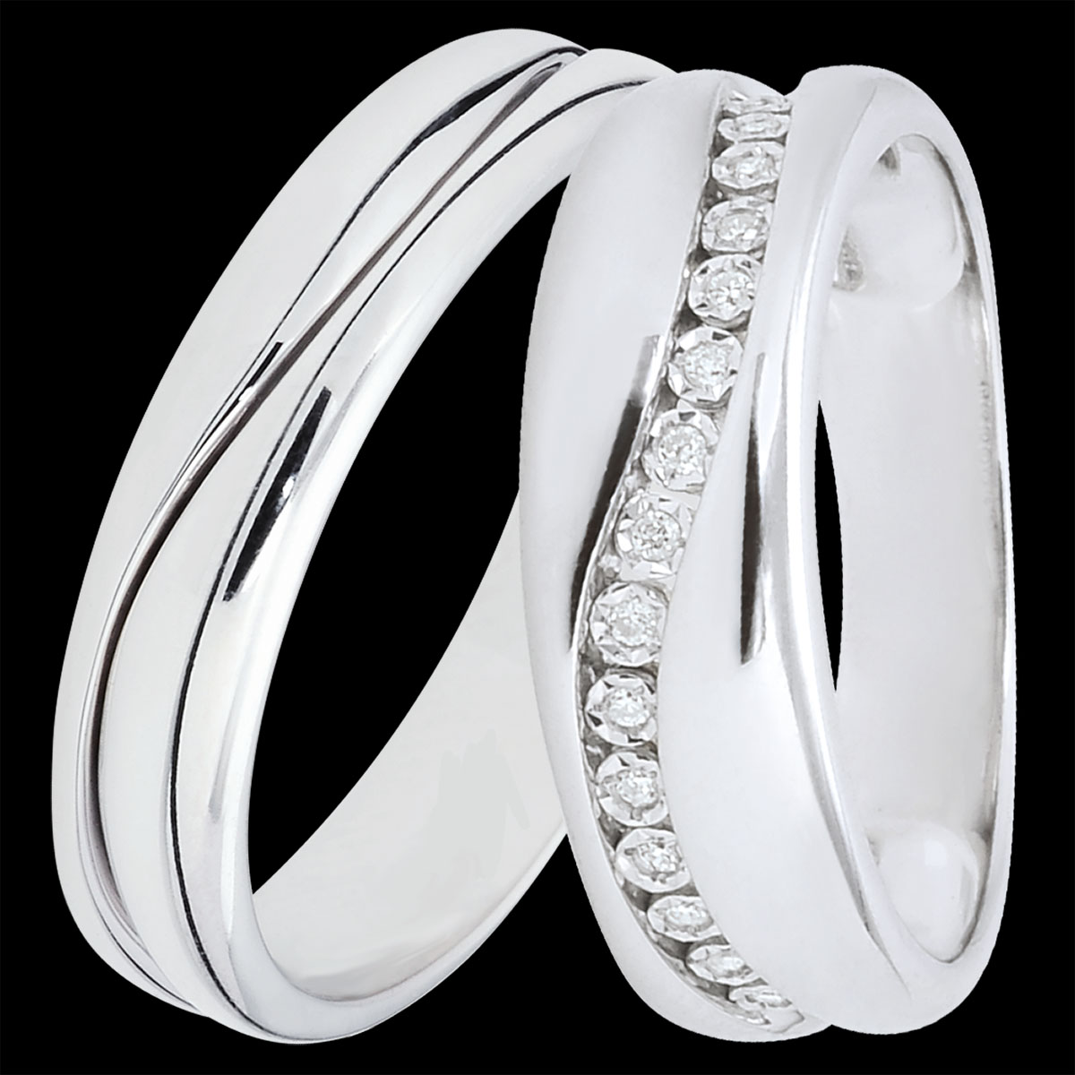 Elegancka para obrączek z białego złota, ozdobiona delikatną falą. Podkreśl wyjątkowy charakter swojej miłości dzięki tej luksusowej biżuterii.