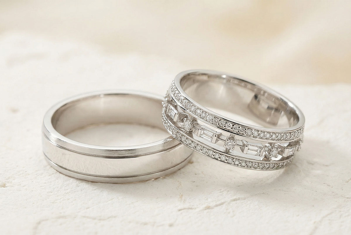 Elegancka para obrączek dla niej i dla niego. Dla niej: pierścionek olśniewający wyjątkową kombinacją brylantów i diamentów bagietkowych na białym złocie. Dla niego: matowa obrączka z białego złota, ozdobiona poziomym, połyskującym paskiem.