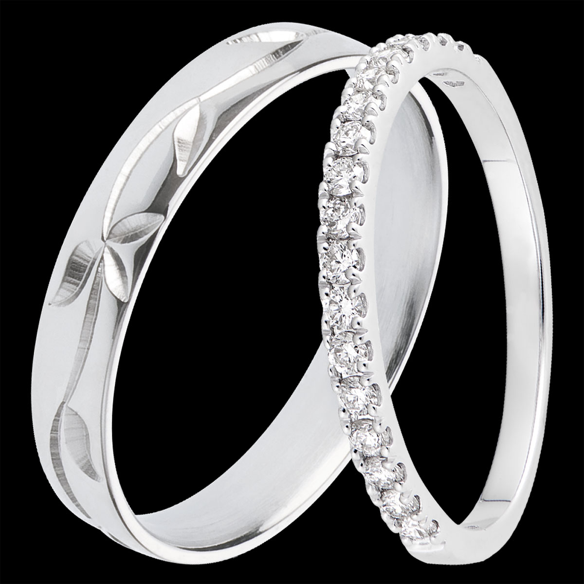 Elegancka para obrączek ślubnych dla niej i dla niego. Dla niej: pół-oprawiona obrączka z 18 diamentami o łącznej masie 0,26 ct. Dla niego: obrączka z białego złota z subtelnym, roślinnym grawerem. Ponadczasowy symbol miłości od Edenly.
