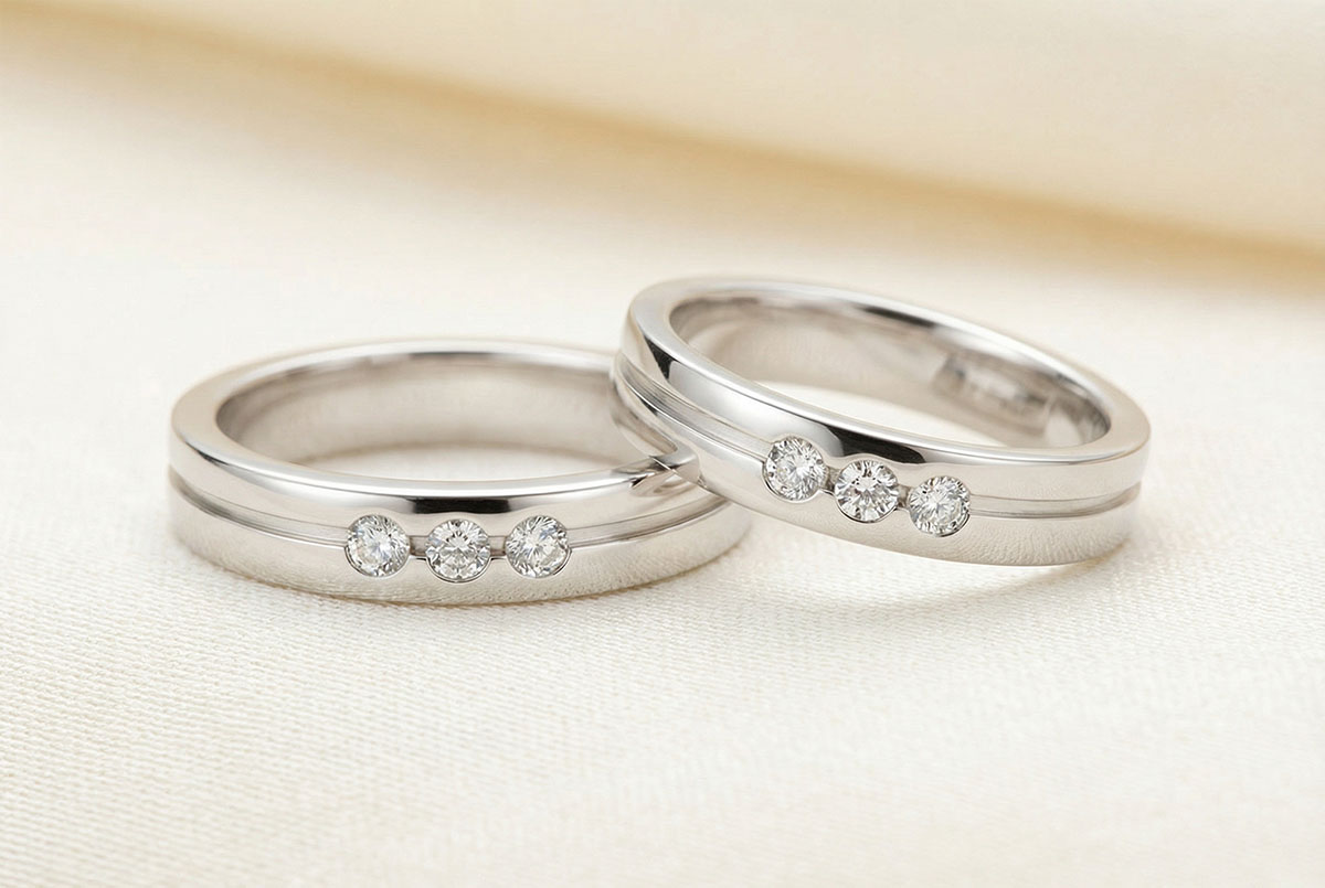 Elegancka para obrączek z białego złota, ozdobiona trylogią diamentów – wyrafinowany symbol jedności i wiecznej miłości.