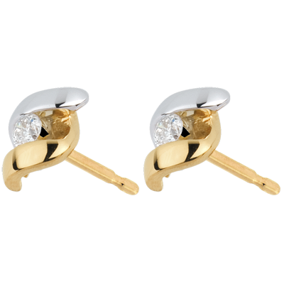 Przecinek z żółtego złota łączący się z przecinkiem z białego złota z diamentem w każdym kolczyku.