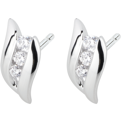 Trzy diamenty osadzone w krzywiźnie białego złota w każdym kolczyku.