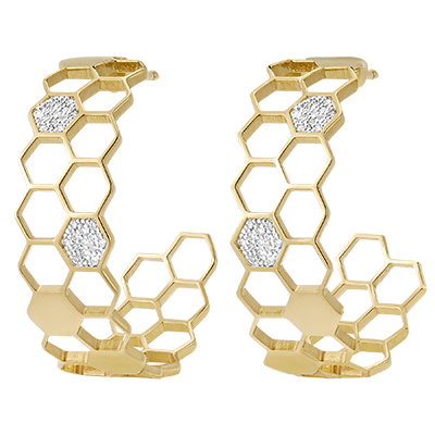 Pozwól się oczarować wyjątkowym pięknem kolczyków Maxi Objawienie. Zostały one zainspirowane szlachetną pracą pszczół, a każdy kolczyk składa się z 2 rzędów perfekcyjnie uformowanych złotych ogniw w kształcie plastra miodu, a zdobi go 7 pełnych ogniw z litego złota i 2 ogniwa subtelnie wysadzane 26 lśniącymi diamentami. Wyjątkowy element biżuterii, zarówno elegancki jak i pełen magii, podkreśli Twój styl na każdą okazję.