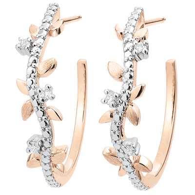 Romantyczne kolczyki w kształcie koła wysadzane 6 diamentami, wykonane naprzemiennie z błyszczących liści z różowego złota i z liści ze złota szczotkowanego ręcznie.