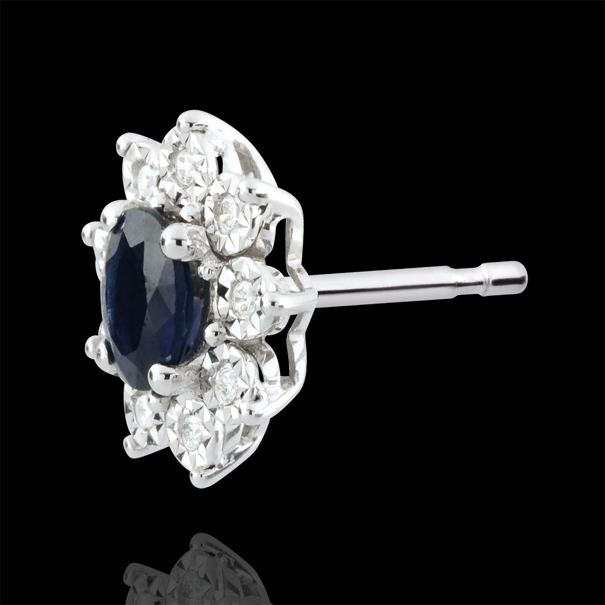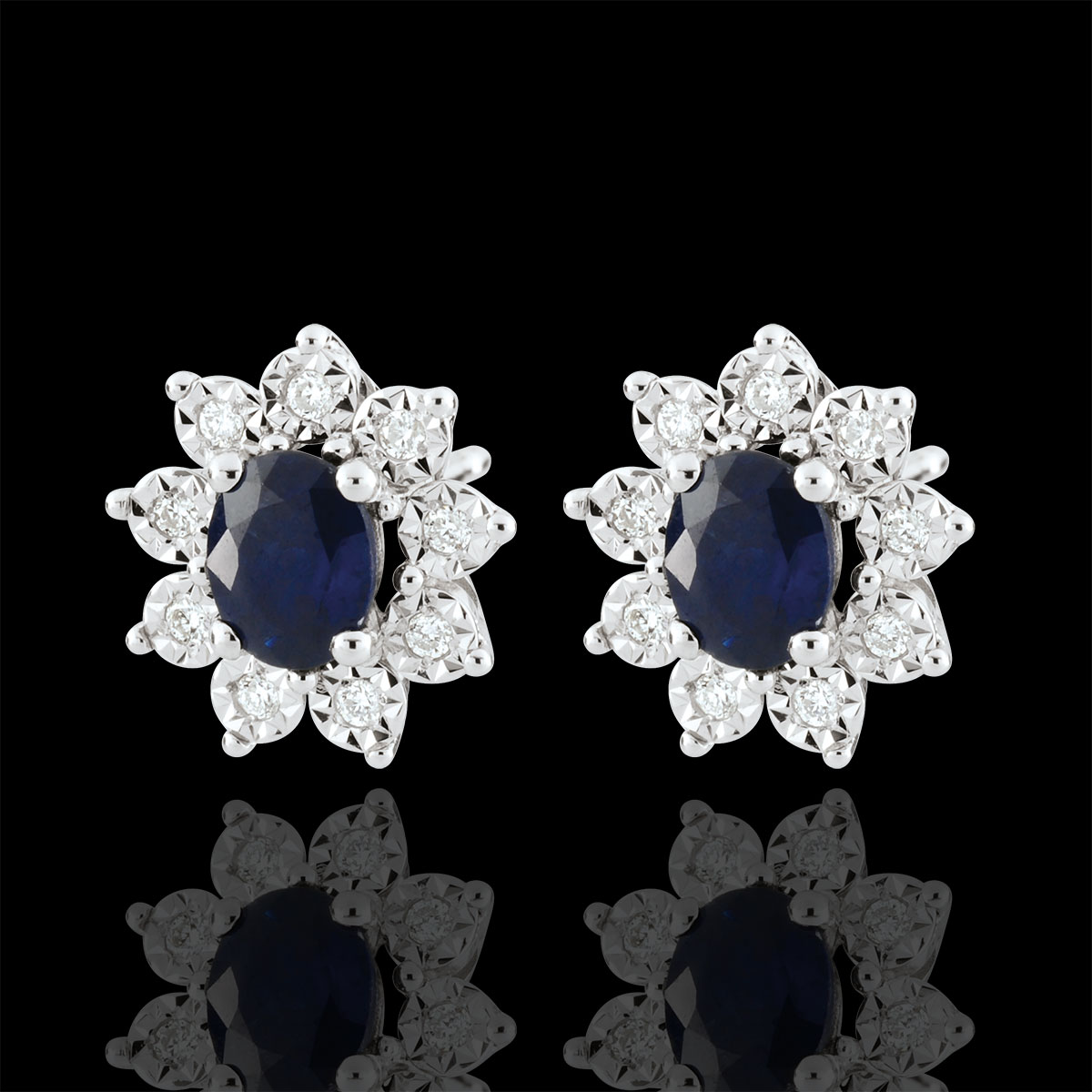 Na każdym sztyfcie owalny syntetyczny szafir stanowi środek margerytki z białego złotka z płatkami wysadzanymi syntetyczne diamenty.
