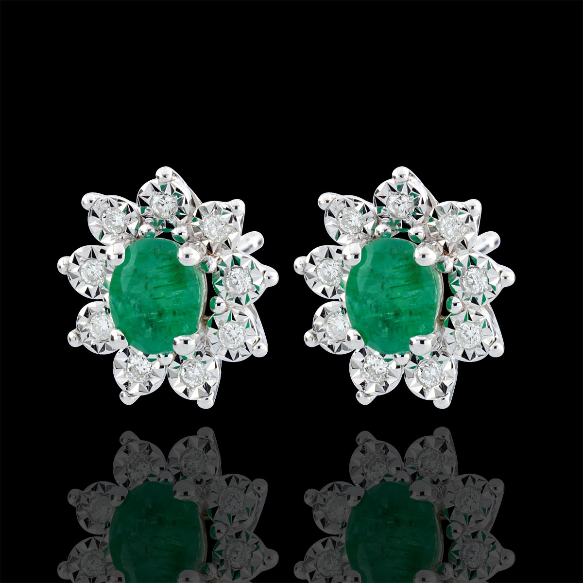 Na każdym sztyfcie owalny syntetyczny szmaragd stanowi środek margerytki z białego złotka z płatkami wysadzanymi syntetyczne diamenty.