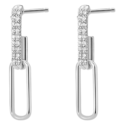 Kolczyki z białego złota, wykonane z 2 ogniw subtelnie zdobionych diamentami, które kołyszą się w rytm Twoich ruchów. Nowoczesne i niezwykle finezyjne kolczyki.