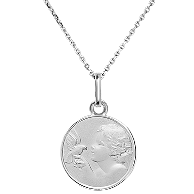 Ten medalion z białego złota przedstawia dziecko, które delikatnie obserwuje gołębia siedzącego na palcu. Symbolizując niewinność, pokój i harmonię, jest idealny na pamiątkę chrztu lub narodzin, ucieleśniając czystość i spokój cennej chwili.