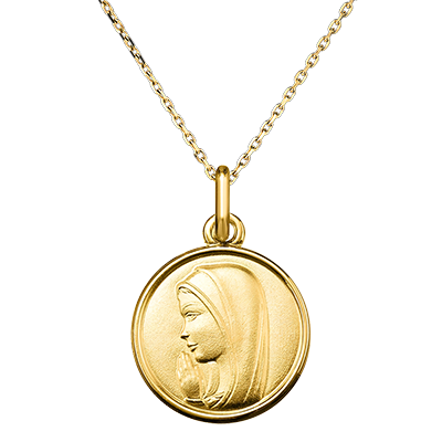 Ten medalion z żółtego złota przedstawia Dziewicę Marię w pozie modlitewnej, z złożonymi rękami i wyrazem spokoju i oddania. Prosty, lecz elegancki design podkreśla łagodność i czystość wizerunku, z delikatnym reliefem podkreślającym boską łaskę Marii. Ten klejnot jest symbolem wiary, ochrony i wewnętrznego spokoju, idealny na duchowe okazje, takie jak chrzest, komunia lub inny święty moment.