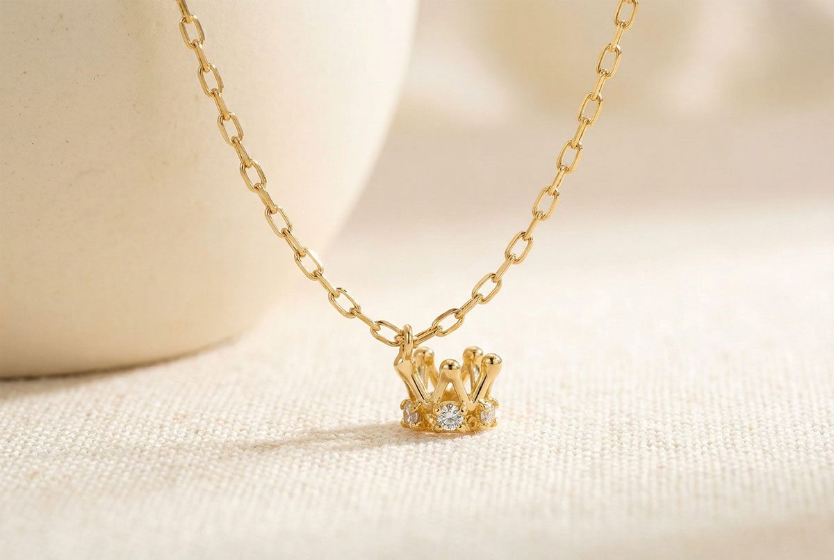 Mała korona ozdobiona pięcioma lśniącymi diamentami – symbol kobiecej gracji i siły.Królewska biżuteria w subtelnej formie, do noszenia na co dzień jako przypomnienie o własnej wartości.