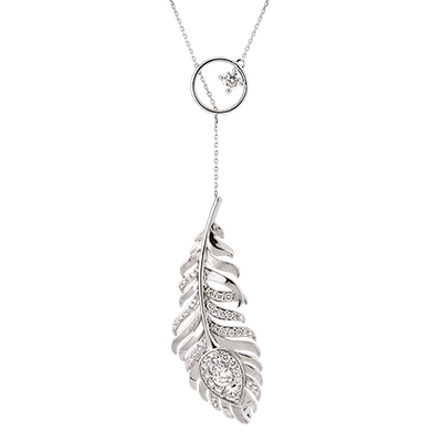 Naszyjnik Sautoir został wykonany z 9-karatowego białego złota i ozdobiony 50 syntetycznymi diamentami, które podkreślają jego zawieszkę w kształcie piórka. Łańcuszek o długości 45 cm i wyrafinowane wzornictwo dodają majestatycznego uroku, który doskonale odzwierciedla spektakularny charakter kolekcji Panache.