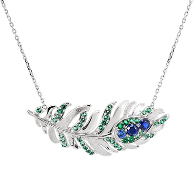 Naszyjnik Signature z 9-karatowego białego złota z elegancką zawieszką w kształcie pióra ozdobioną 44 syntetycznymi szmaragdami i szafirami. Całość odzwierciedla eteryczną subtelność i niezrównane wyrafinowanie cechujące pióra, będące symbolem kolekcji Panache.