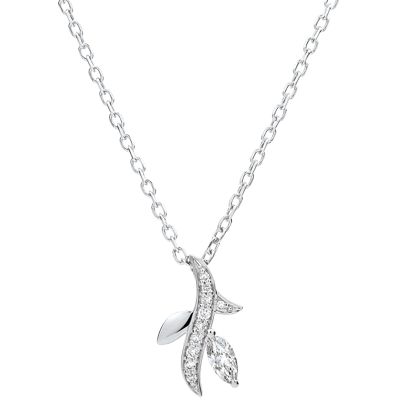 Błyszcząca gałąź utrwalona w ponadczasowej odsłonie. Jej kunsztowny liść, diamentowa łezka, jest podkreślony oprawą z białego złota wysadzanego brylantami.