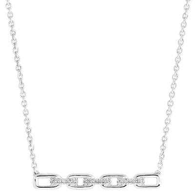 Cztery duże kubańskie ogniwa wysadzane diamentami stanowiące kontrast z delikatnym łańcuszkiem, tworzą klasyczny naszyjnik z białego złota w nowoczesnej odsłonie. Z łańcuszkiem o długości 45cm i kółkiem do regulacji obwodu do 42cm.