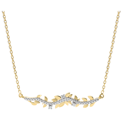 Romantyczny naszyjnik wysadzany 7 diamentami, wykonany naprzemiennie z błyszczących liści z żółtego złota i z liści ze złota szczotkowanego ręcznie.
