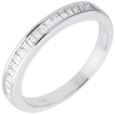 Obrączka o kwadratowym przekroju, w połowie wysadzana diamentami. Diamenty o szlifie „bagieta” w oprawie kanałowej.