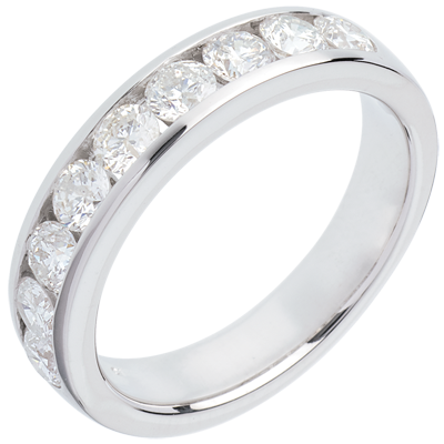 Doskonała równowaga w obrączce o wyrazistej symbolice, wysadzanej okrągłymi diamentami w oprawie kanałowej. Niezastąpiona ozdoba jako wyraz wyjątkowej więzi.