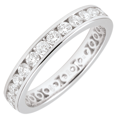 Doskonała równowaga w obrączce z białego złota o wyrazistej symbolice, wysadzanej okrągłymi diamentami w oprawie kanałowej. Niezastąpiona ozdoba jako wyraz wyjątkowej więzi.