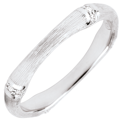 Elastyczna i trwała bambusowa tyczka przeobrażona w wieczną obrączkę z szczotkowanego białego złota wysadzaną diamentami. Wykonane ręcznie wykończenie matowe nadaje obrączce ujmujący naturalny i realistyczny wygląd.