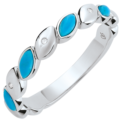Nowoczesna obrączka z białego złota łącząca z wyrafinowaniem turkusowe łezki z diamentami. Obrączkę można również nosić jako wyjątkowy pierścionek.