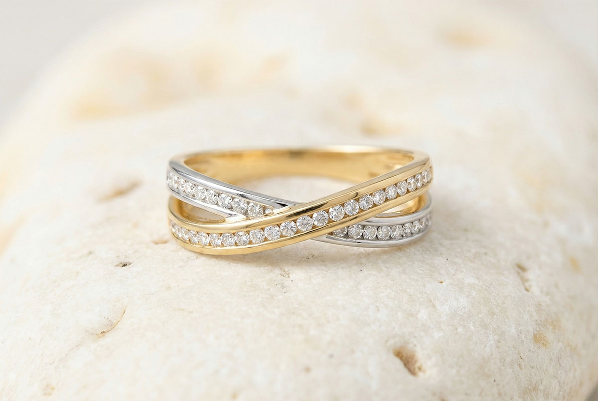 Tandem eliptycznych obrączek z białego i żółtego złota wysadzanych diamentami, symbolizujących związek i doskonałą harmonię.