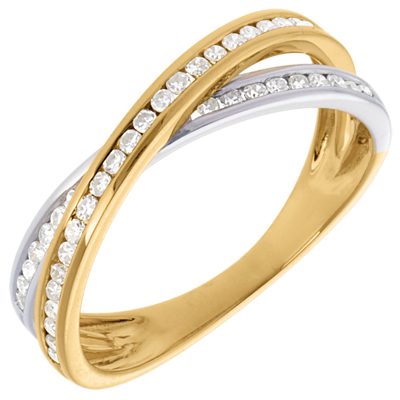 Tandem eliptycznych obrączek z białego i żółtego złota wysadzanych diamentami, symbolizujących związek i doskonałą harmonię.