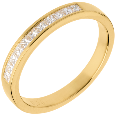 Obrączka o kwadratowym przekroju, w połowie wysadzana diamentami. Diamenty o szlifie „princessa” w oprawie kanałowej.
