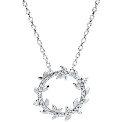 Romantyczny naszyjnik wysadzany 6 diamentami, wykonany naprzemiennie z błyszczących liści z białego złota i z liści ze złota szczotkowanego ręcznie.