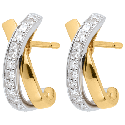 Tandem półksiężyców ze złota żółtego i białego wysadzanych diamentami w okrągłej i wyrafinowanej parze kolczyków.