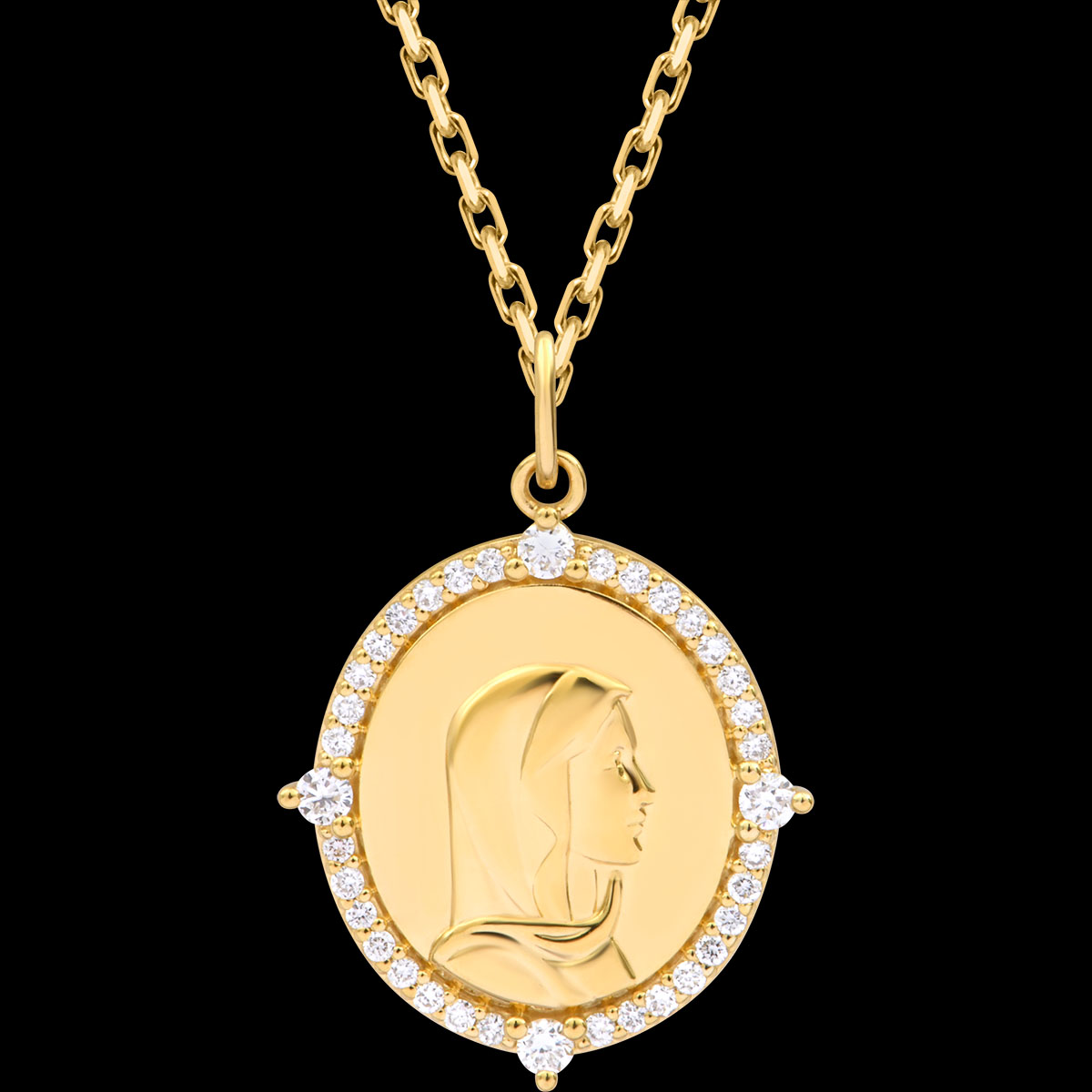 Ten owalny medalik z 9-karatowego żółtego złota przedstawia Matkę Boską misternie wyrzeźbioną w reliefie, otoczoną oprawą z syntetycznych diamentów oraz bocznymi zdobieniami, które podkreślają jego blask i elegancję.Wymiary: 17 x 19 mm – 25 mm wysokości z zawieszkąWykończenie: Polerowane żółte złotoZapakowany w eleganckie pudełko – gotowy na prezent