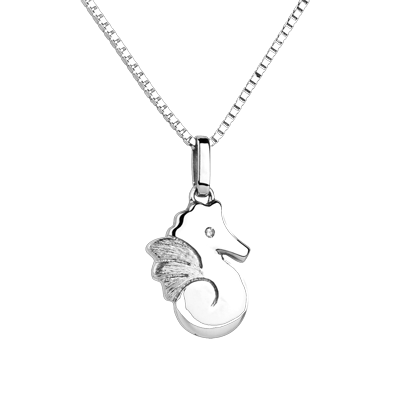 Mały konik morski z białego złota o zaokrąglonych kształtach i okiem z diamentu. Duży model.