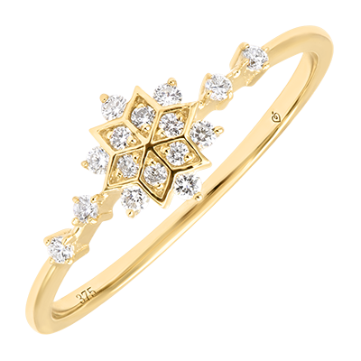 Delikatny blask szesnastu diamentów syntetycznych rozświetla geometryczny, kwiatowy wzór.Poetycka i uporządkowana biżuteria niczym płatek śniegu zamknięty w złocie.