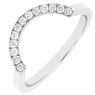 Obrączka Contour z diamentami dodaje dodatkowego blasku zestawowi Romance Moderne. Wykonana z polerowanego złota, jej subtelna krzywizna podkreślona jest przez pavé lśniących diamentów, które delikatnie akcentują kształt pierścionka centralnego. Noszona samodzielnie lub w duecie z obrączką Contour i pierścionkiem Cabochon Aura Nacrée, ukazuje pełnię nowoczesnego i wyrafinowanego stylu.